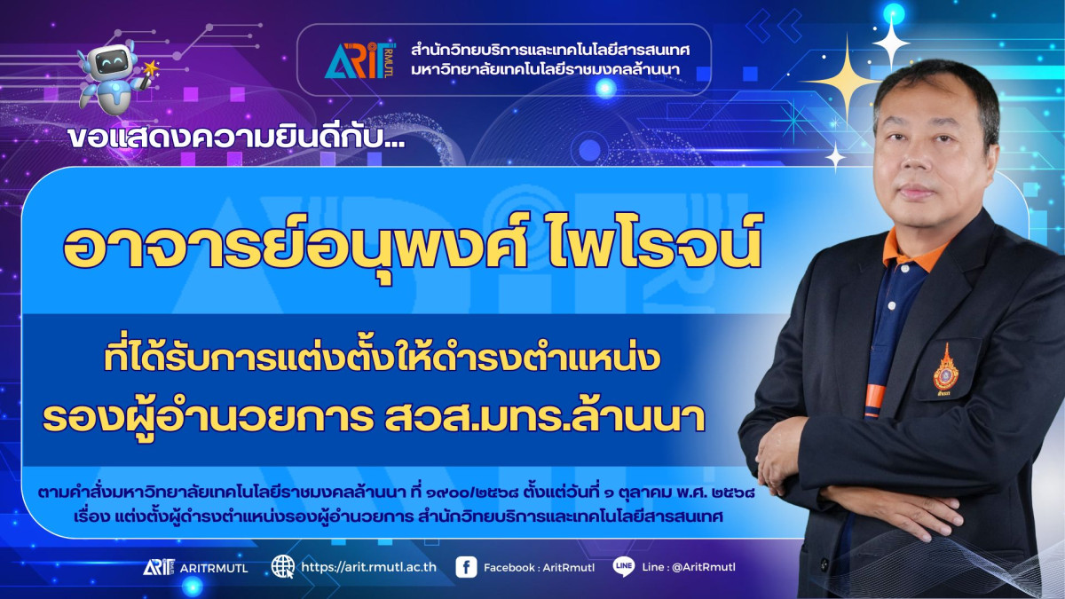 โลโก้เว็บไซต์ สวส.มทร.ล้านนา : ขอแสดงความยินดีกับ อาจารย์อนุพงศ์ ไพโรจน์ ที่ได้รับการแต่งตั้งให้ดำรงตำแหน่งรองผู้อำนวยการ | สำนักวิทยบริการและเทคโนโลยีสารสนเทศ