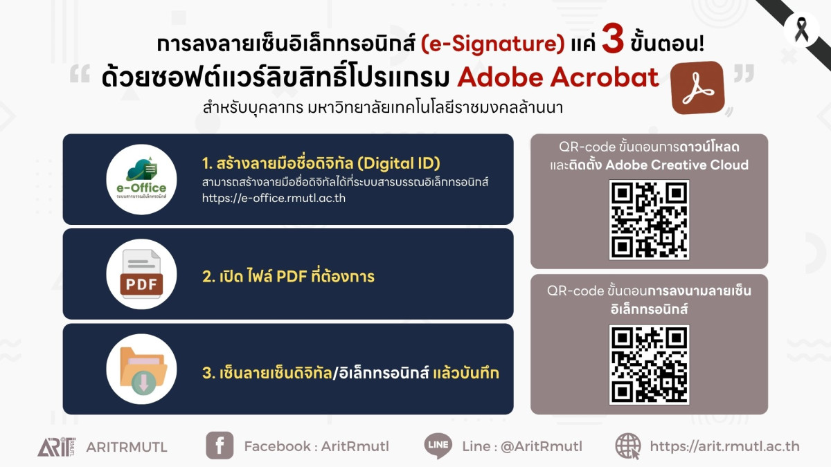 1.สร้างลายมือชื่อดิจิทัล (Digital ID) สามารถสร้างลายมือชื่อดิจิทัลได้ที่ระบบสารบรรณอิเล็กทรอนิกส์ https://e-office.rmutl.ac.th