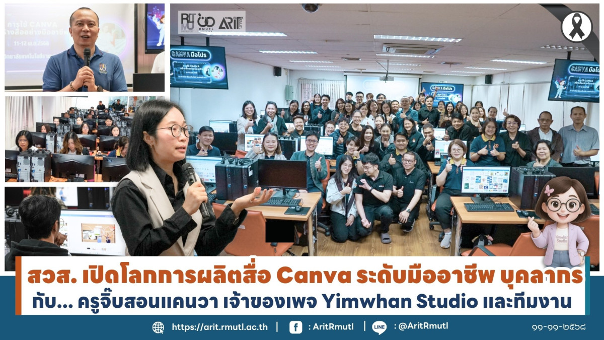 ระหว่างวันที่ ๑๑ - ๑๒ พฤศจิกายน ๒๕๖๘ งานผลิตสื่อมัลติมีเดีย กลุ่มงานบริการการศึกษา สำนักวิทยบริการและเทคโนโลยีสารสนเทศ มหาวิทยาลัยเทคโนโลยีราชมงคลล้านนา (สวส.มทร.ล้านนา) จัดโครงการอบรมเชิงปฏิบัติการ “การใช้ Canva สร้างสื่ออย่างมืออาชีพ” ด้วยแพลตฟอร์ม Canva กับวิทยากรผู้เชี่ยวชาญมืออาชีพ ครูจิ๊บสอนแคนวา เจ้าของเพจ Yimwhan Studio (คุณธัญชนก สีหาพล) และคุณณธิดา มนัสสกุล ณ ห้องฝึกปฏิบัติการ Virtual Desktop ๑ อาคารหอสมุด สวส.มทร.ล้านนา มีนายณัฏฐ์พัฒน์ คนมีฉลาด นักวิชาการโสตทัศนศึกษา ชำนาญการ (ปฏิบัติหน้าที่หัวหน้ากลุ่มงานบริการการศึกษา) กล่าวรายงานฯ ได้รับเกียติจากผู้ช่วยศาสตราจารย์ ดร.ประเสริฐ ลือโขง ผู้อำนวยการ สวส.มทร.ล้านนา กล่าวเปิดงาน พร้อมด้วยนางปวีญา ทองปรอน เจ้าหน้าที่บริหารงานทั่วไป ชำนาญการ (รักษาการในตำแหน่งหัวหน้าสำนักงาน) กล่าวต้อนรับ โดยกลุ่มเป้าหมายที่สนใจลงทะเบียนเข้าร่วมการอบรมฯ คือ อาจารย์ บุคลากร จาก มทร.ล้านนา ๖ พื้นที่