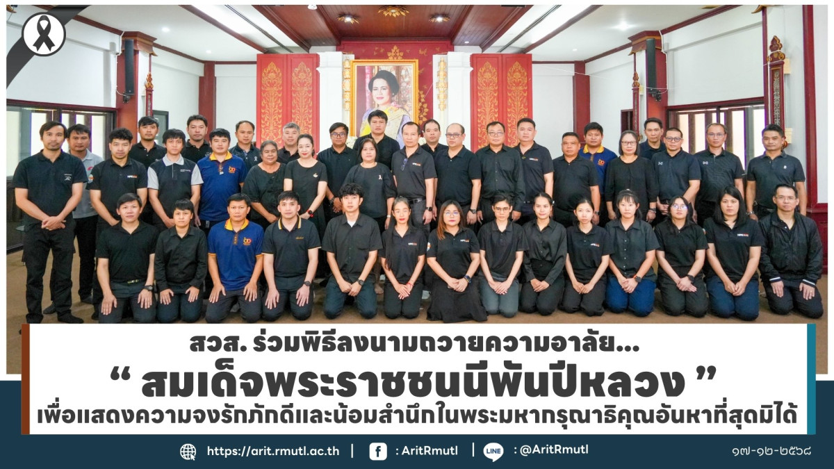 วันนี้ ๑๗ ธันวาคม พ.ศ. ๒๕๖๘ เวลา ๑๓.๓๐ น. ผู้ช่วยศาสตราจารย์ ดร.ประเสริฐ ลือโขง ผู้อำนวยการ สำนักวิทยบริการและเทคโนโลยีสารสนเทศ มหาวิทยาลัยเทคโนโลยีราชมงคลล้านนา (สวส.มทร.ล้านนา) คณะผู้บริหาร พร้อมด้วยบุคลากร ร่วมพิธีลงนามถวายความอาลัย แด่สมเด็จพระนางเจ้าสิริกิติ์ พระบรมราชินีนาถ พระบรมราชชนนีพันปีหลวง ณ มณฑลพิธีศาลาราชมงคล มทร.ล้านนา เชียงใหม่