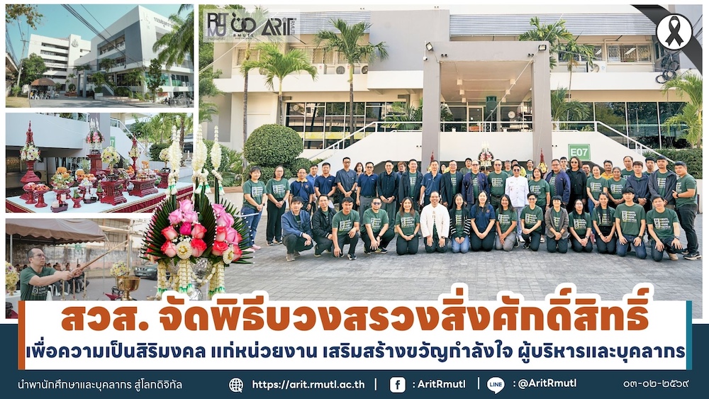 วันนี้ ๓ กุมภาพันธ์ ๒๕๖๙ เวลา ๐๙.๓๐ น. สำนักวิทยบริการและเทคโนโลยีสารสนเทศ จัดกิจกรรม กิจกรรมบวงสรวงสิ่งศักดิ์สิทธิ์ประจำหน่วยงาน เพื่อความเป็นสิริมงคลในการดำเนินงาน เสริมสร้างขวัญและกำลังใจแก่ผู้บริหารและบุคลากร