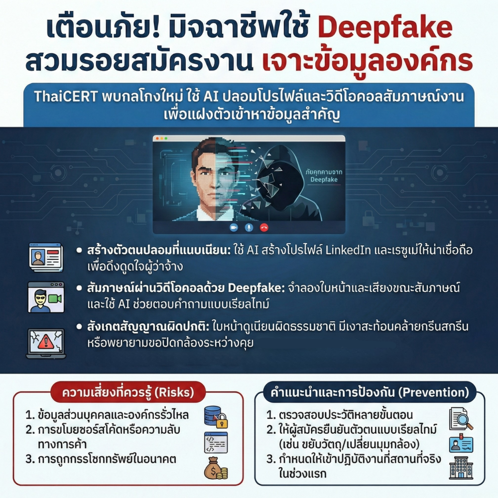 ThaiCERT รายงานกรณีตัวอย่างจากแวดวงความมั่นคงปลอดภัยไซเบอร์ เมื่อซีอีโอของสตาร์ทอัพด้าน AI Security เกือบตกเป็นเหยื่อขบวนการหลอกลวงที่ใช้เทคโนโลยี Deepfake ปลอมตัวเป็นผู้สมัครงาน โดยมิจฉาชีพสร้างโปรไฟล์ LinkedIn และเรซูเม่ด้วย AI อย่างแนบเนียน ก่อนเข้าสัมภาษณ์ผ่าน