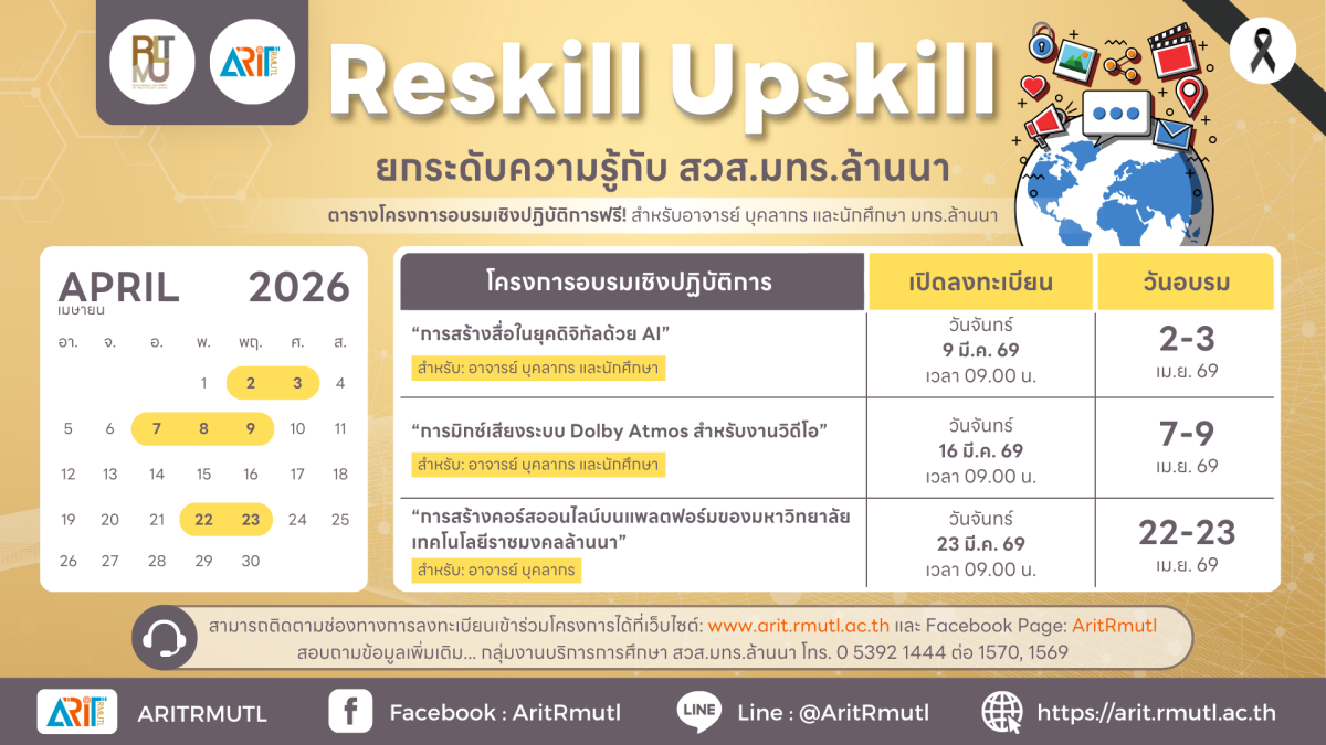 Reskill & Upskill >>> โครงการอบรมเชิงปฏิบัติการฟรี..!! สำหรับอาจารย์ บุคลากร และนักศึกษา มทร.ล้านนา