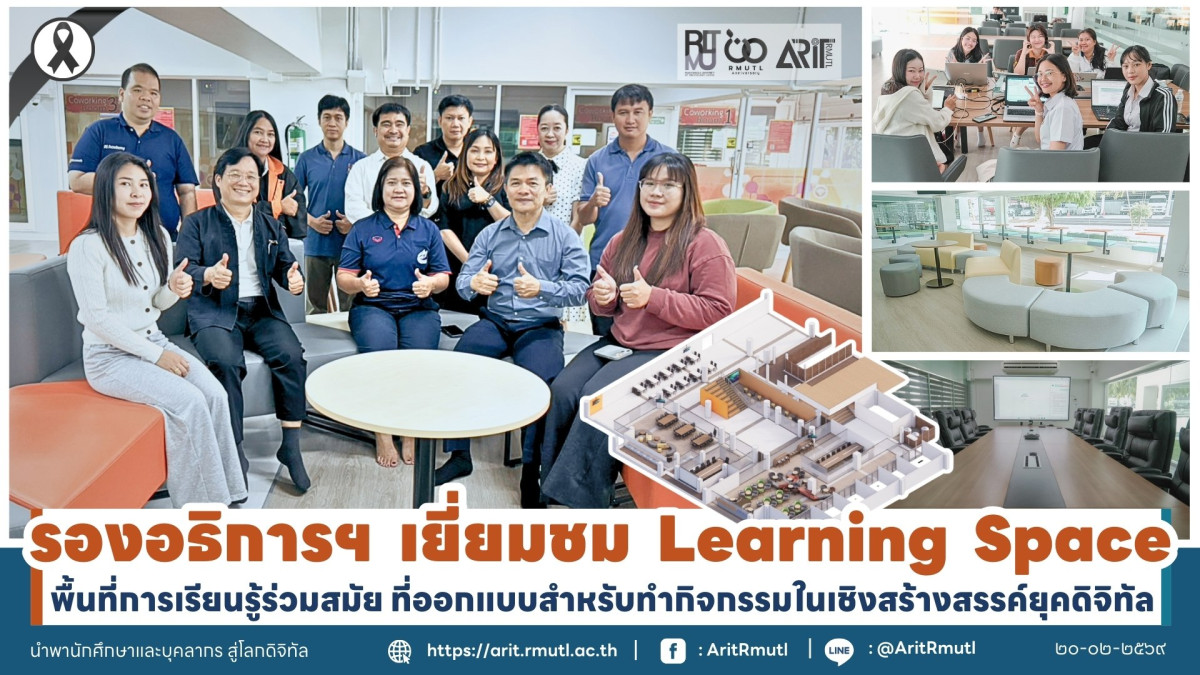 โดยมี นางปวีณา ทองปรอน (เจ้าหน้าที่บริหารงานทั่วไป ชำนาญการ) รักษาการในตำแหน่งหัวหน้าสำนักงาน พร้อมด้วยบุคลากร สวส. ให้การต้อนรับ ซึ่งห้อง Learning Space เปิดให้บริการ สำหรับอาจารย์ บุคลากร และนักศึกษา วันนี้ (วันแรก) เป็นพื้นที่การเรียนรู้ร่วมสมัยในเชิงสร้างสรรค์ ที่ออกแบบให้ตอบโจทย์การเรียนรู้ในยุคดิจิทัล ที่มีความครบถ้วน ทันสมัย และเอื้อต่อการจัดกิจกรรมการเรียนรู้ในรูปแบบต่าง ๆ ทั้งรายบุคคลและการทำงานกลุ่ม ซึ่งวันและเวลาเปิดให้บริการ คือ วันจันทร์ - ศุกร์ เวลา ๐๘.๓๐ - ๑๘.๓๐ น., วันเสาร์ - อาทิตย์ เวลา เวลา ๐๘.๓๐ - ๑๖.๓๐ น. และปิดให้บริการในวันหยุดนักขัตฤกษ์ ด้านการให้บริการห้องต่างๆ สามารถดำเนินการจองใช้บริการผ่านระบบจองห้อง : https://booking.rmutl.ac.th ประกอบด้วย ๑.ห้องประชุม (ขนาด ๑๒ ที่นั่ง) จำนวน ๑ ห้อง ๒.ห้องประชุม (ขนาด ๑๔ ที่นั่ง) จำนวน ๑ ห้อง ๓.ห้องนำเสนอผลงาน( ขนาด ๓๐ ที่นั่ง) จำนวน ๑ ห้อง และ ๔.ห้อง Co-Working จำนวน ๖ ห้อง ส่วนพื้นที่โดยรอบภายใน Learning Space มีโต๊ะ เก้าอี้ บริการเข้าใช้งานโดยไม่ต้องจองการใช้บริการ