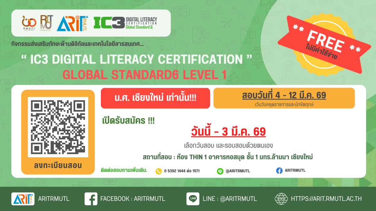 งานบริการเทคโนโลยีสารสนเทศและฝึกอบรม สำนักวิทยบริการและเทคโนโลยีสารสนเทศ ขอประชาสัมพันธ์เชิญชวนนักศึกษา เข้าร่วมกิจกรรมส่งเสริมการพัฒนาทักษะด้านดิจิทัลและเทคโนโลยีสารสนเทศ เสริมสร้างความเชี่ยวชาญและเพิ่มขีดความสามารถเพื่อผลิตกำลังคนที่มีคุณภาพ และเตรียมความพร้อมสำหรับการทำงานในยุคดิจิทัล โดยจัดให้มีการอบรมผ่านระบบ e-Learning และการทดสอบ หลักสูตร Training - Digital Literacy โดยมีกลุ่มเป้าหมายประกอบด้วยนักศึกษาที่มีความสนใจในการพัฒนาและทดสอบมาตรฐานด้านเทคโนโลยีสารสนเทศ