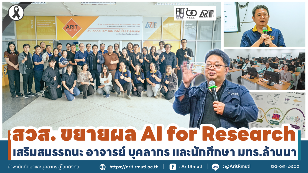 สำนักวิทยบริการและเทคโนโลยีสารสนเทศ มหาวิทยาลัยเทคโนโลยีราชมงคลล้านนา (สวส.มทร.ล้านนา) โดยงานบริการเทคโนโลยีและฝึกอบรม จัดโครงการอบรมเชิงปฏิบัติการประยุกต์ใช้งานปัญญาประดิษฐ์และความปลอดภัยของข้อมูลสารสนเทศ สำหรับอาจารย์ บุคลากร และนักศึกษา มทร.ล้านนา ระหว่างวันที่ ๒๔ - ๒๕ มีนาคม พ.ศ. ๒๕๖๙ โดยมี ดร.ศราวุธ คงยัง นักวิจัยกลุ่มวิจัยปัญญาประดิษฐ์ ศูนย์เทคโนโลยีอิเล็กทรอนิกส์และคอมพิวเตอร์แห่งชาติ (เนคเทค) เป็นวิทยากรบรรยายและถ่ายทอดองค์ความรู้ ด้านนายออมทรัพย์ อินกองงาม นักวิชาการคอมพิวเตอร์ ชำนาญการ หัวหน้างานบริการเทคโนโลยีและฝึกอบรม กล่าวรายงานฯ ได้รับเกียรติจากอาจารย์ณัฐชาสิทธิ์ ชูเกียรติขจร รักษาราชการแทนผู้อำนวยการฯ กล่าวเปิดงาน ณ ห้องฝึกอบรม ๒ ชั้น ๒ อาคาร สวส. (ห้องสมุด) มทร.ล้านนา เชียงใหม่