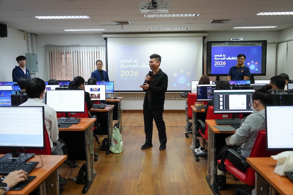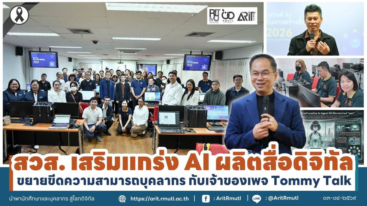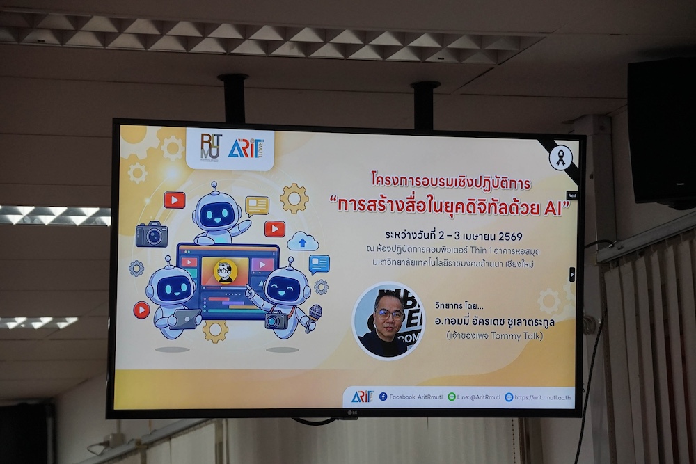ระหว่างวันที่ ๒ - ๓ เมษายน ๒๕๖๙ สำนักวิทยบริการและเทคโนโลยีสารสนเทศ มหาวิทยาลัยเทคโนโลยีราชมงคลล้านนา (สวส.มทร.ล้านนา) โดยงานผลิตสื่อและมัลติมีเดีย กลุ่มงานบริการการศึกษา จัดโครงการอบรมเชิงปฏิบัติการ “ การสร้างสื่อในยุคดิจิทัลด้วย AI” กับ อาจารย์ทอมมี่ คุณอัครเดช ซูเลาตระกูล (เจ้าของเพจ Tommy Talk) เป็นวิทยากรอบรม ณ ห้องฝึกปฏิบัติการ Virtual Desktop ๑ อาคารหอสมุด สวส.มทร.ล้านนา มีนายณัฏฐ์พัฒน์ คนมีฉลาด นักวิชาการโสตทัศนศึกษา ชำนาญการ ปฏิบัติหน้าที่หัวหน้ากลุ่มงานบริการการศึกษา กล่าวรายงานฯ ได้รับเกียติจากผู้ช่วยศาสตราจารย์จักรภพ ใหม่เสน รักษาราชการแทนผู้อำนวยการ กล่าวเปิดงาน โดยกลุ่มเป้าหมายที่สนใจลงทะเบียนเข้าร่วมการอบรมฯ คือ อาจารย์ บุคลากร และนักศึกษา จาก มทร.ล้านนา ๖ พื้นที่