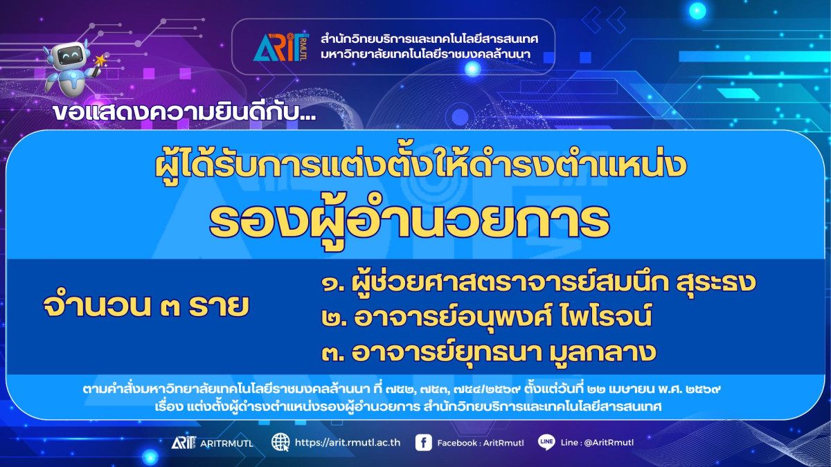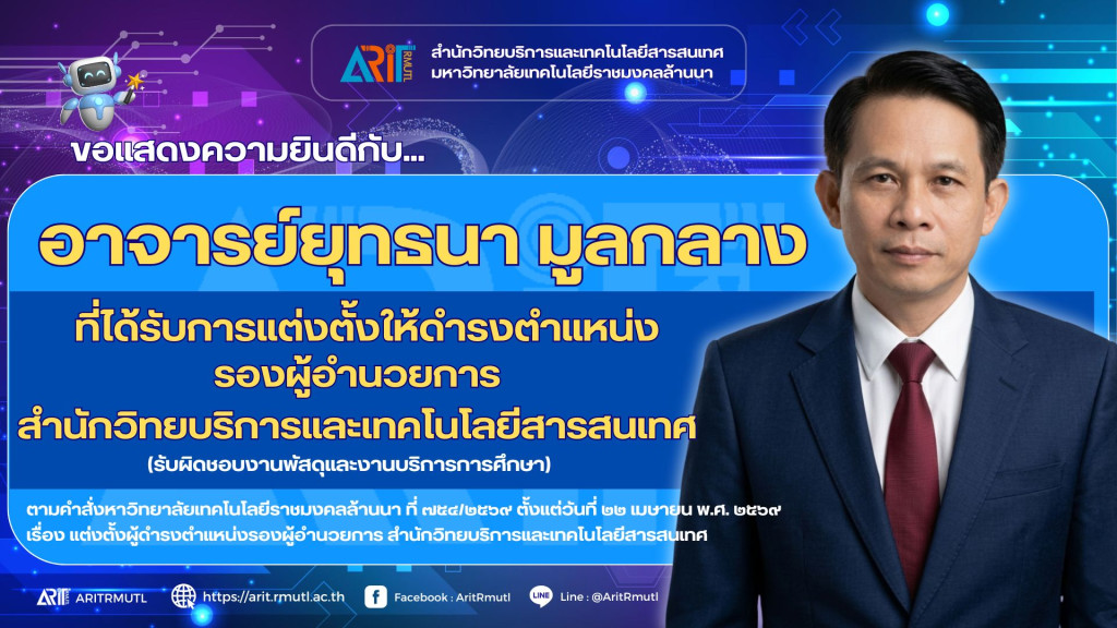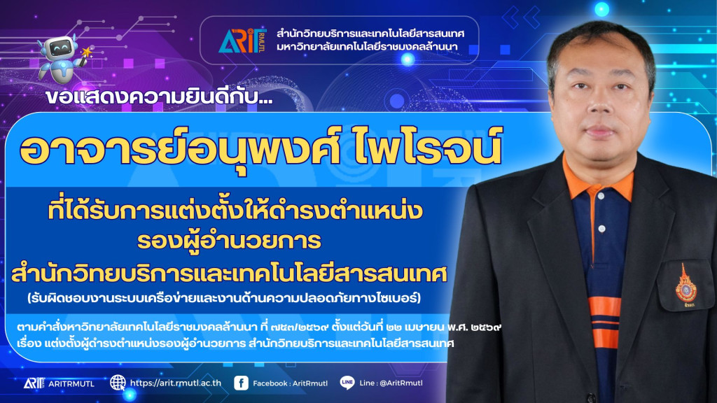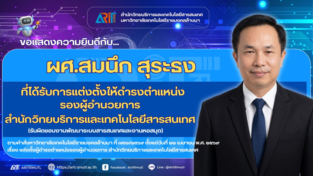 สวส.มทร.ล้านนา : ขอแสดงความยินดีกับผู้ได้รับการแต่งตั้งให้ดำรงตำแหน่ง รองผู้อำนวยการ สำนักวิทยบริการและเทคโนโลยีสารสนเทศ