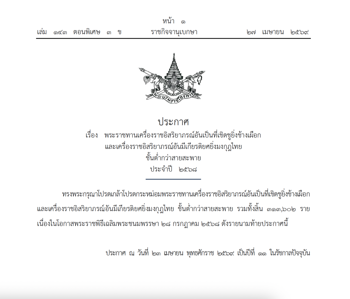 ประกาศ...ราชกิจจานุเบกษาเผยแพร่ประกาศ เรื่อง พระราชทานเครื่องราชอิสริยาภรณ์อันเป็นที่เชิดชูยิ่งช้างเผือกและเครื่องราชอิสริยาภรณ์อันมีเกียรติยศยิ่งมงกุฎไทย ชั้นต่ำกว่าสายสะพาย ประจำปี ๒๕๖๘